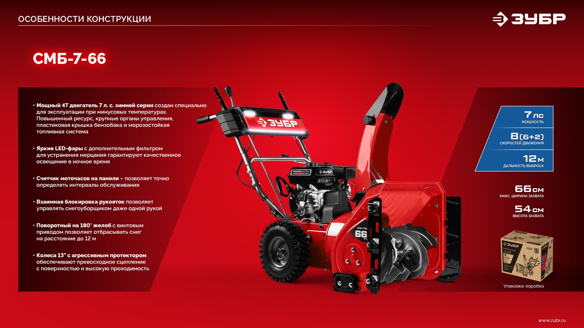 Снегоуборщик бензиновый, МАСТЕР Рабочая ширина 66 см Рабочая высота 54 см Мощность 7 л.с. Число скоростей 6 вперед/2 назад Диаметр колес 13 дюйм Двигатель ЗУБР WINTER PRO Яркие LED фары6+2 передачи Металлический шнек-ледоруб Расширители ковша