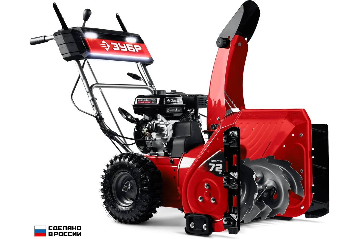 Снегоуборщик бензиновый, Рабочая ширина 72 см Рабочая высота 54 см Мощность 7 л.с. Стартер ручной Число скоростей 6 вперед /2 назад Диаметр колес 14 дюйм Двигатель ЗУБР WINTER PRO Яркие LED фары 6+2 передачи Металлический шнек-ледоруб Расширители ковша