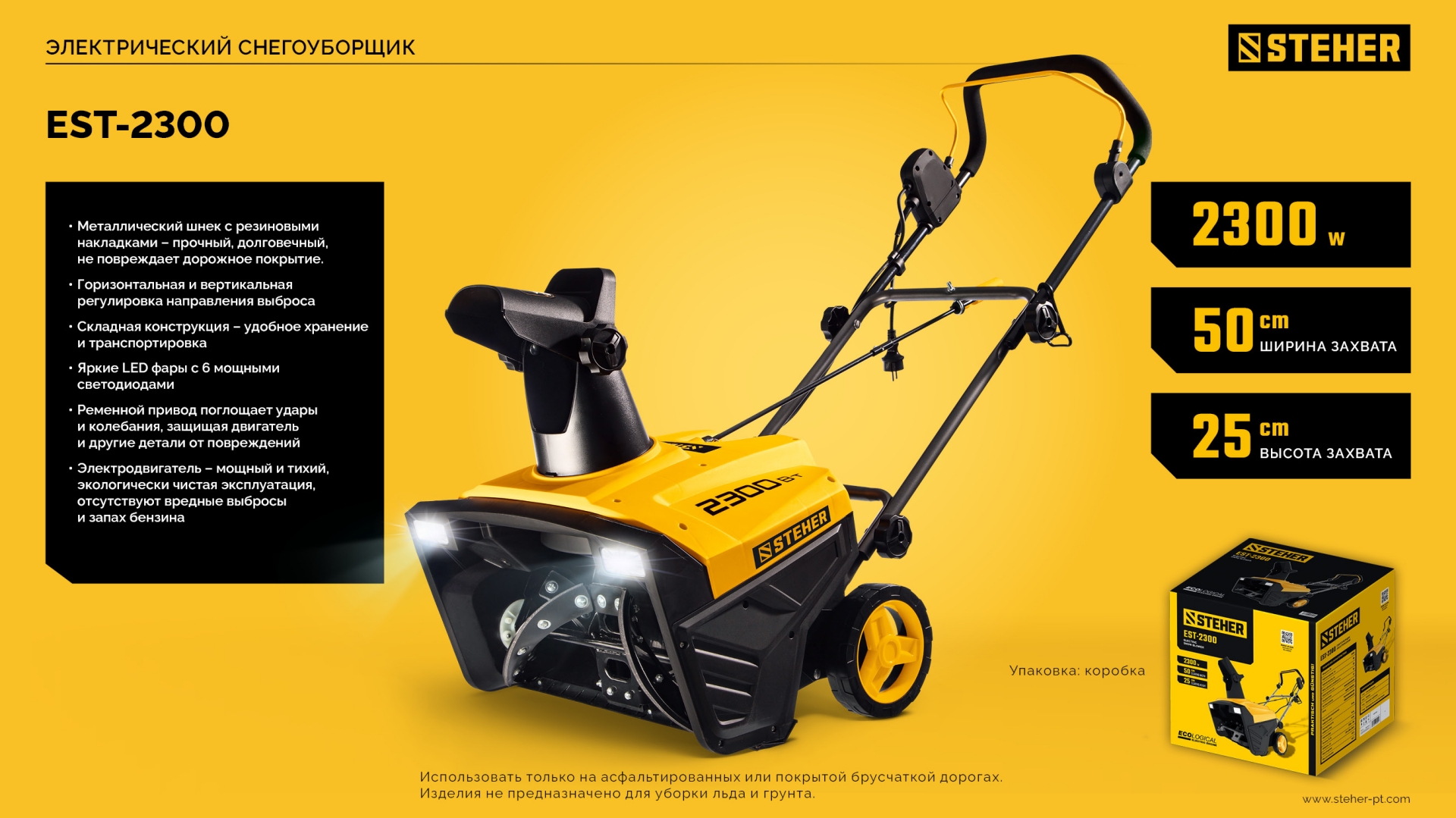 Снегоуборщик электрический Сравнить Рабочая ширина 500 мм Рабочая высота 250 мм Мощность 2300 Вт Диаметр колес 7 дюйм Электрический двигатель Металлический обрезиненный шнек LED-фары Ременной привод
